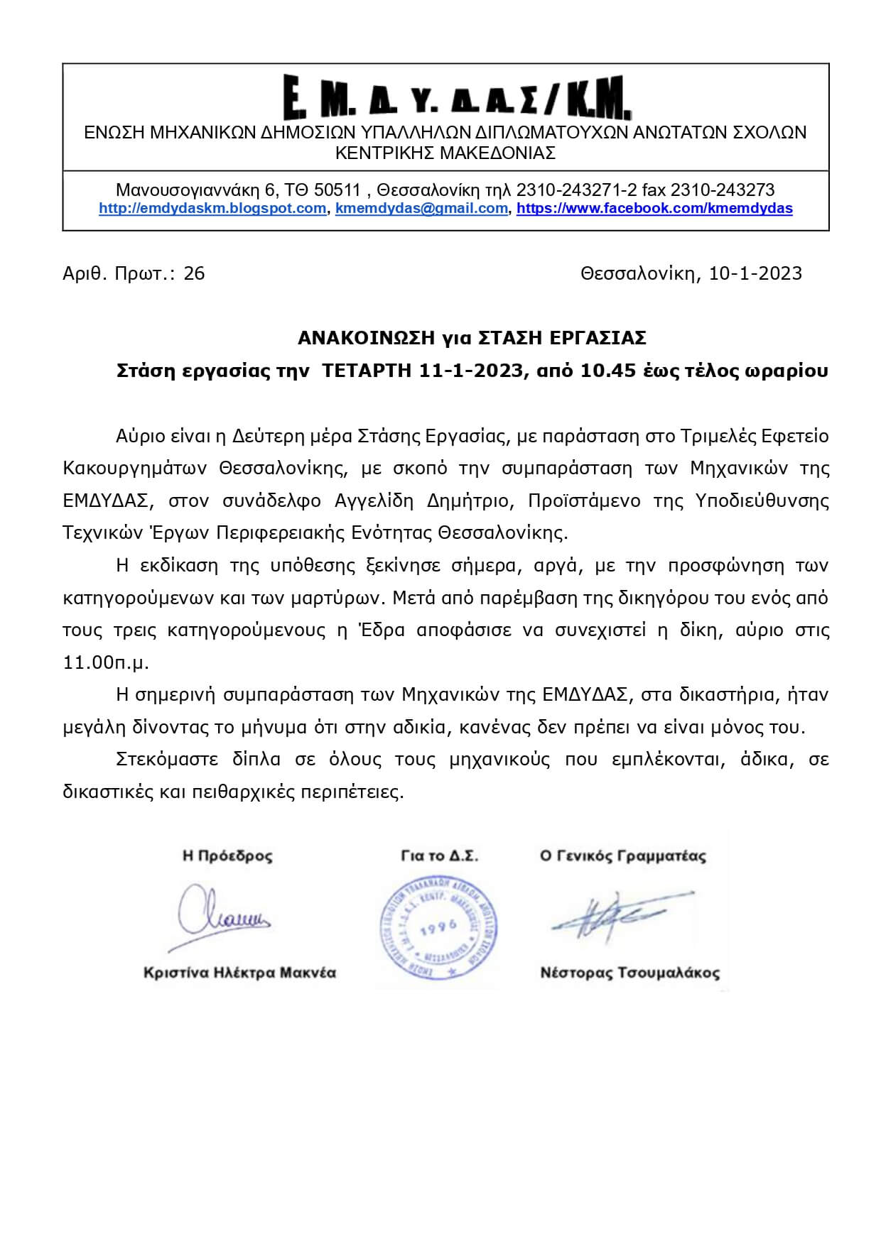 Ανακοίνωση για Στάση Εργασίας : την Τετάρτη 11-1-2023, από 10.45 έως τέλος ωραρίου / Κεντρικής Μακεδονίας / 11/01/2023 Ανακοίνωση για Στάση Εργασίας : την Τετάρτη 11-1-2023, από 10.45 έως τέλος ωραρίου .jpg