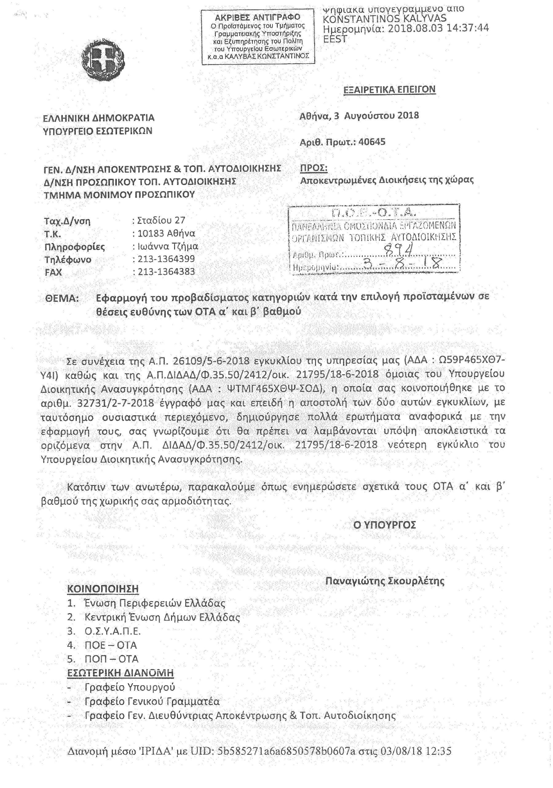 Εγκύκλιος Υπ. Εσωτ.: Εφαρμογή του προβαδίσματος κατηγοριών – επιλογή προϊσταμένων σε θέσεις ευθύνης. .jpg
