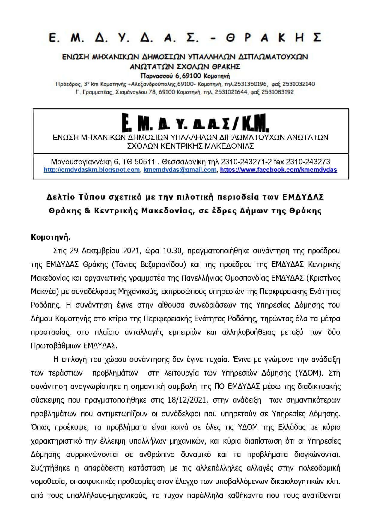 Κοινό Δελτίο Τύπου σχετικά με την πιλοτική περιοδεία των ΕΜΔΥΔΑΣ Θράκης & Κεντρικής Μακεδονίας, σε έδρες Δήμων της Θράκης