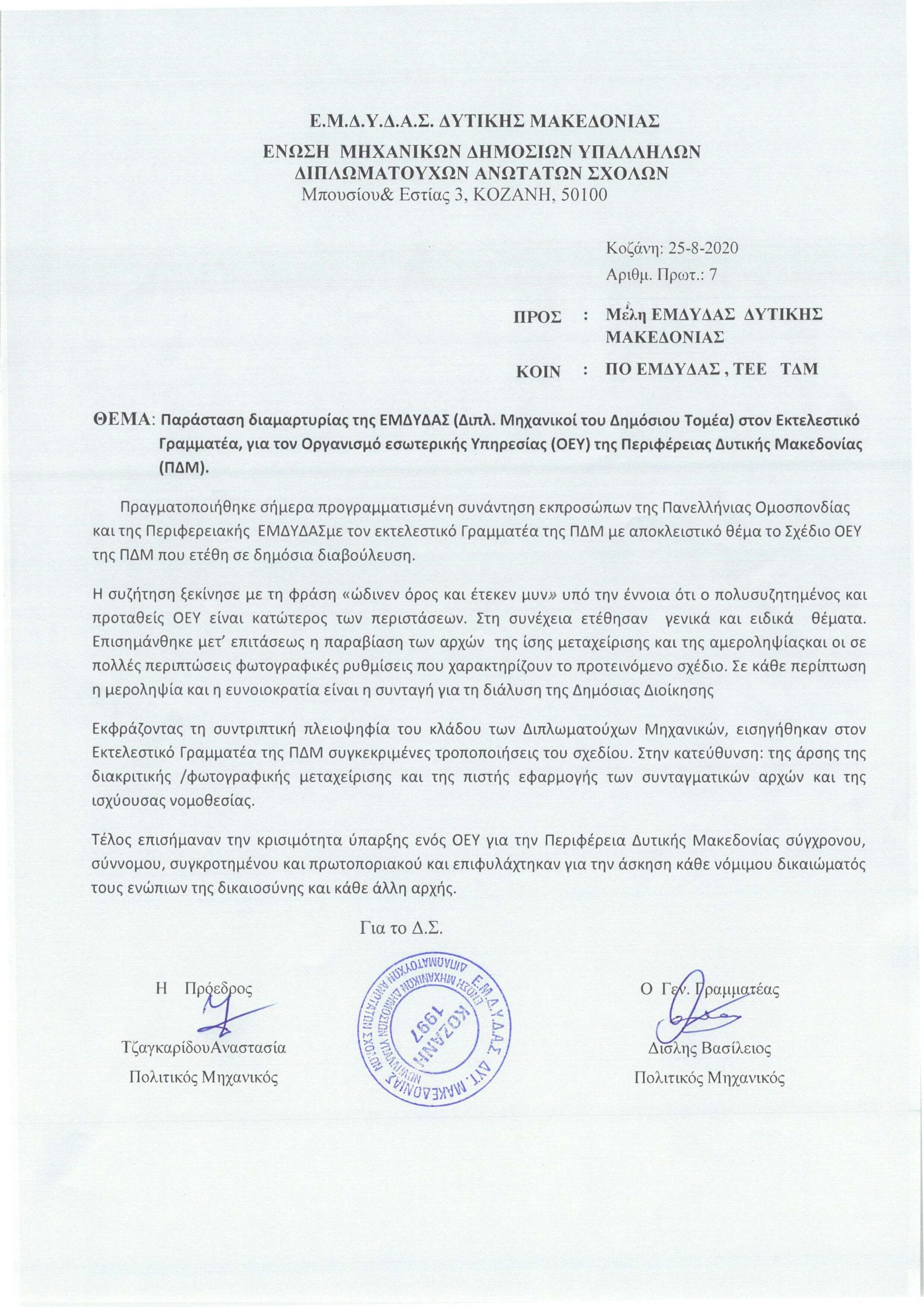 Παράσταση διαμαρτυρίας της ΕΜΔΥΔΑΣ στον Εκτελεστικό Γραμματέα,για τον Οργανισμό Εσωτερικής Υπηρεσίας (ΟΕΥ) της Περιφέρειας Δυτικής Μακεδονίας (ΠΔΜ)