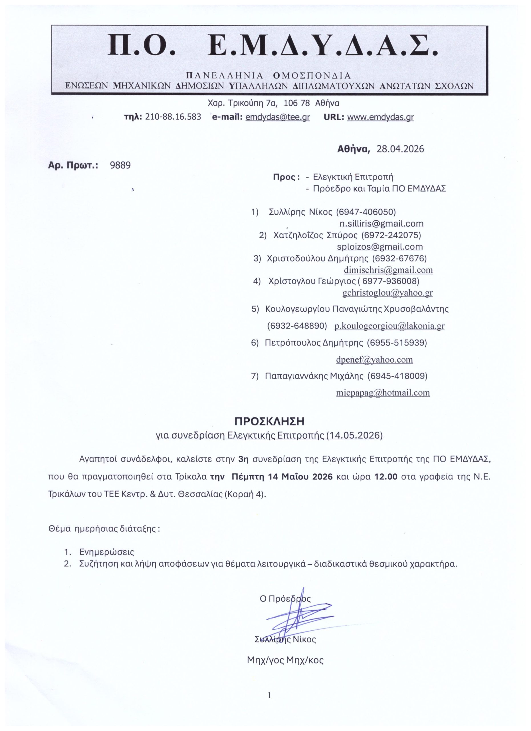 Πρόσκληση για συνεδρίαση Ελεγκτικής Επιτροπής (14.05.2026) / Νέα της Π.Ο. Ε.Μ.Δ.Υ.Δ.Α.Σ. / 28/04/2026 Πρόσκληση για συνεδρίαση Ελεγκτικής Επιτροπής (14.05.2026)Πρόσκληση Ελεγκτικής (14.5.2026) Τρίκαλα
